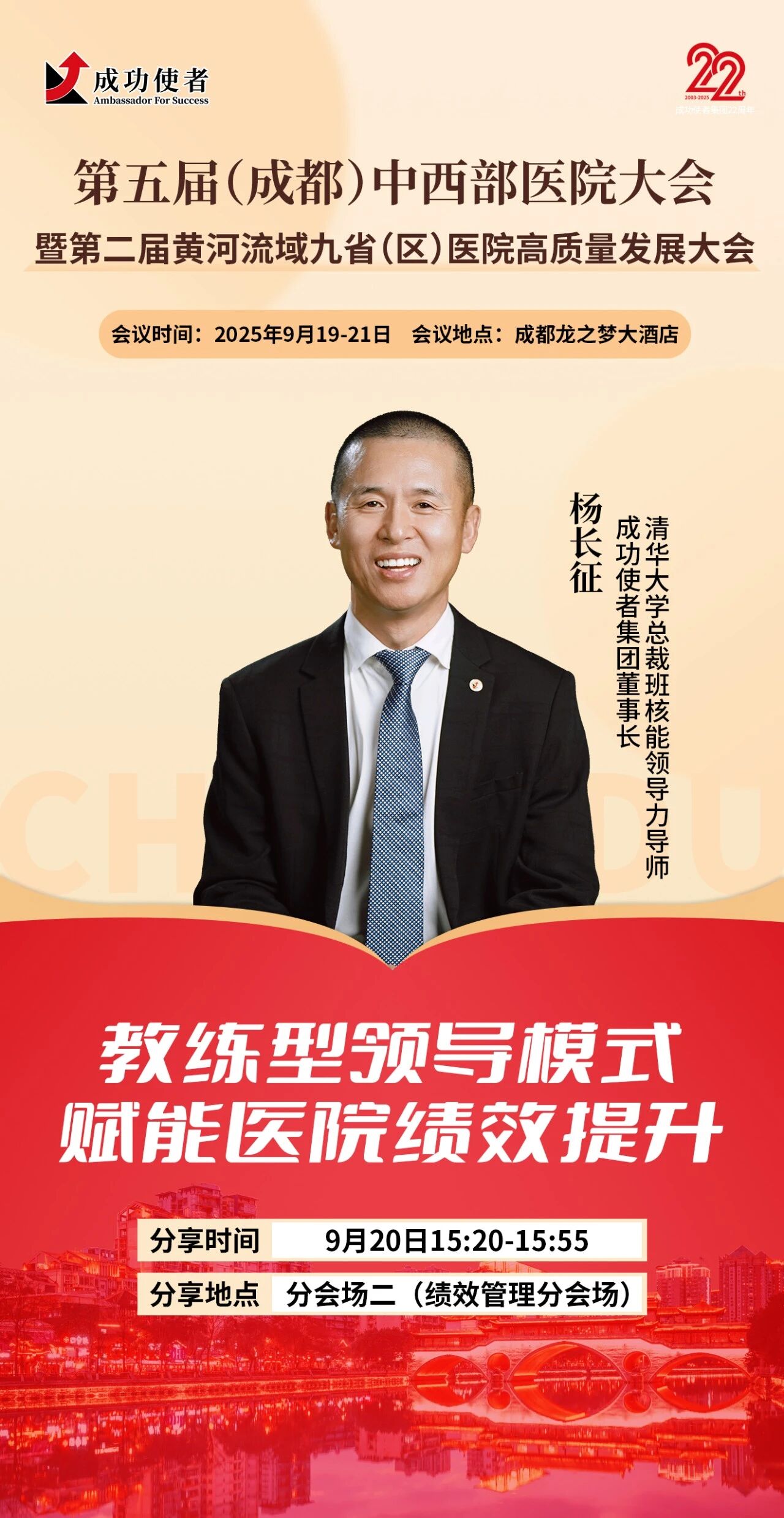 届时(9月20日15:20-15:55),成功使者集团董事长杨长征老师将在绩效管理分会场受邀分享“教练型领导模式赋能医院绩效提升”,为提升医院领导者的领导力、解决运营管理难题、激发员工工作热情等提供新思路。