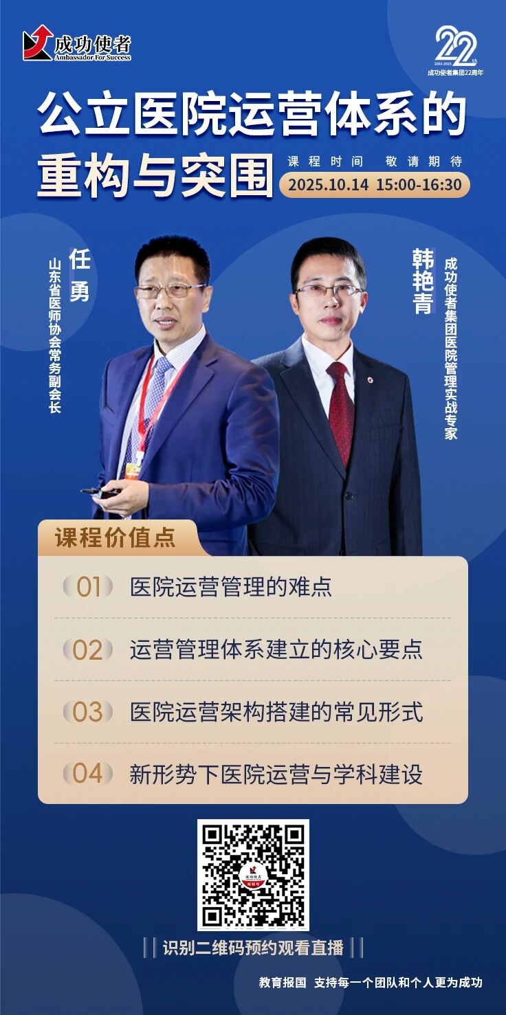 为帮助医院破解运营管理难题,构建科学高效的运营体系,成功使者集团将于10月14日15:00-16:30举办专题线上课程——“公立医院运营体系的重构与突围”,为您带来前沿理念与实践经验。