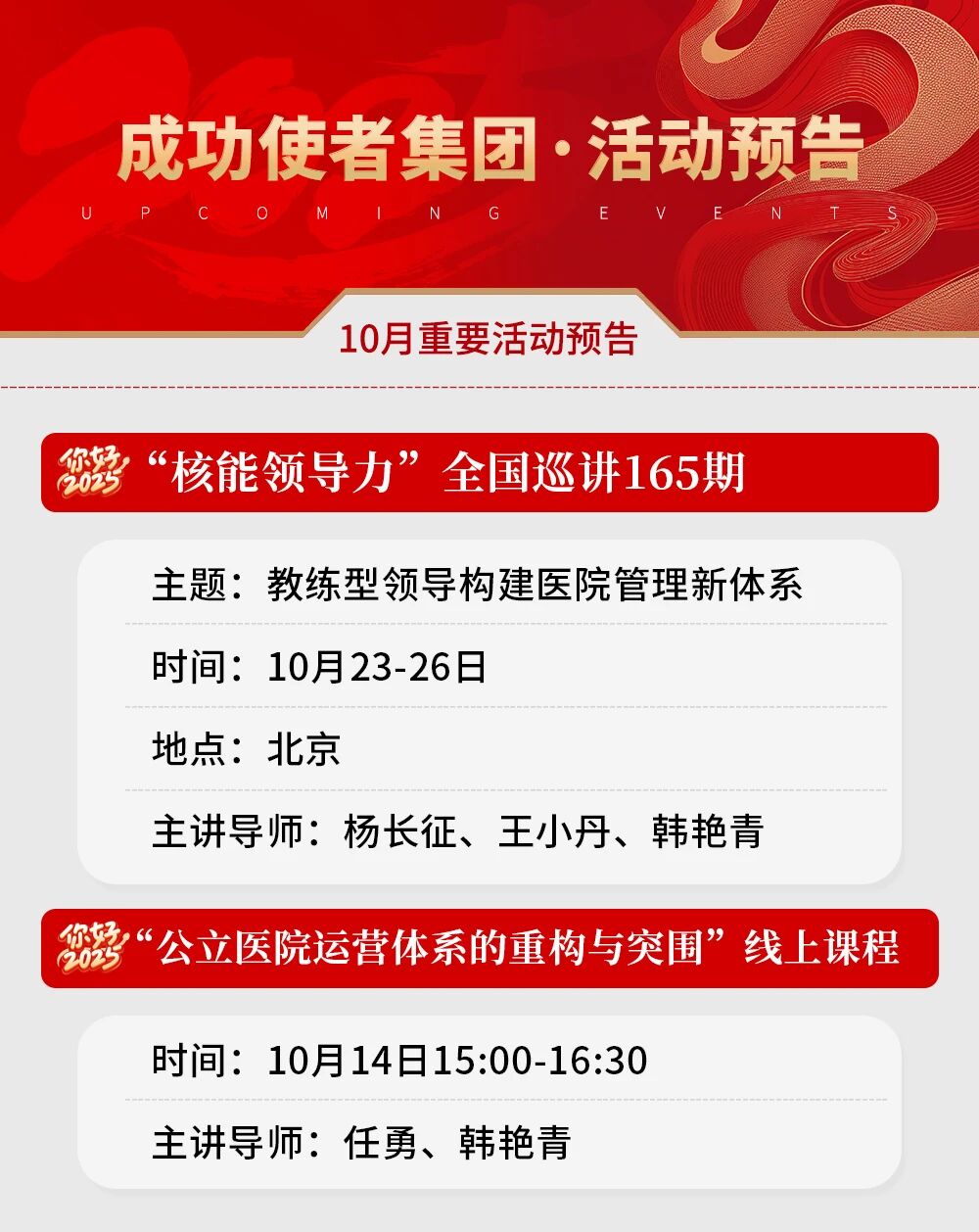 9月,成功使者集团为10个省(自治区、直辖市)的单位实施了“目标支持系统”“教练会”等项目和“运营管理能力提升”“打造高效职业化团队”“打造高效执行力团队”“凝心聚力明责任 提质增效强运营”“医院发展规划与运营”“强服务、精管理、提效能”“破局突围——激活医院发展新动能”等课程,对参训单位及个人在提高管理能力、明确责任目标、激发工作热情等方面给予了多维度的支持。