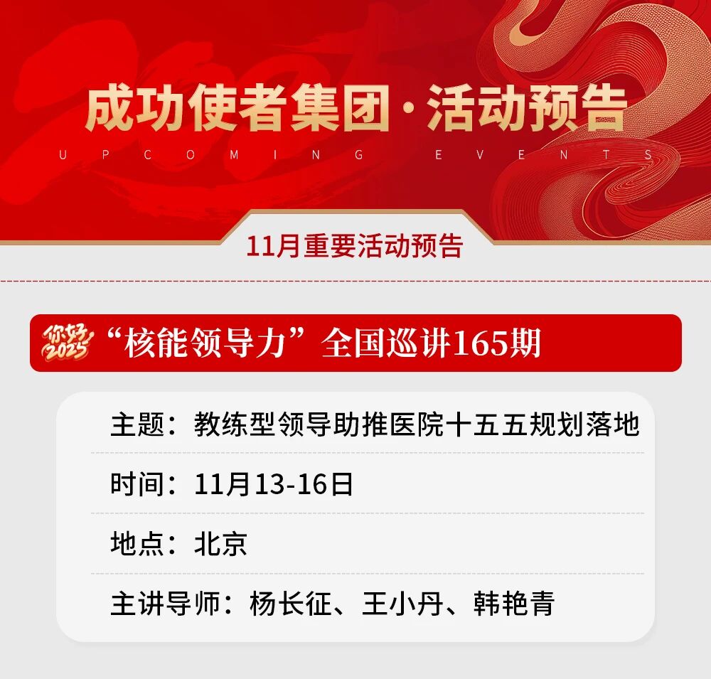 10月14日,成功使者集团成功举办了以“公立医院运营体系的重构与突围”为主题的线上课程。本次课程特邀成功使者集团医院管理实战专家韩艳青与山东中医药大学附属医院原院长任勇联袂授课,吸引了数千人参加。课程紧扣公立医院高质量发展的时代命题与运营管理面临的现实挑战,通过理论讲解、案例剖析与互动答疑,助力医院管理者突破管理瓶颈,全面提升运营效能。