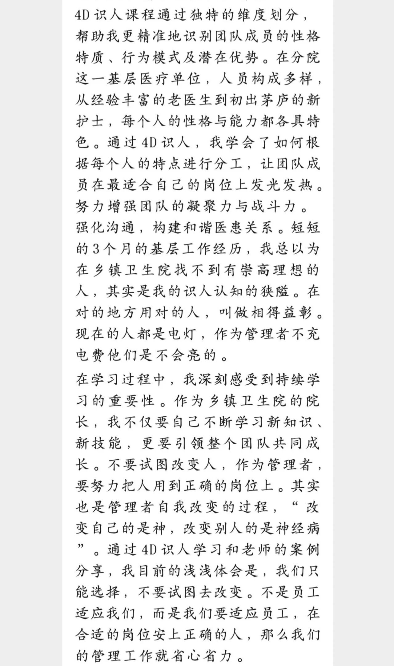 通过系统的学习研讨和深入的互动交流,学员们普遍反映收获颇丰。有学员说:“4D识人为医院精细化管理提供了科学的人才调配思路,让我对以往的管理困惑有种顿悟的感觉。”在大家的积极参与下,本次课程圆满收官。