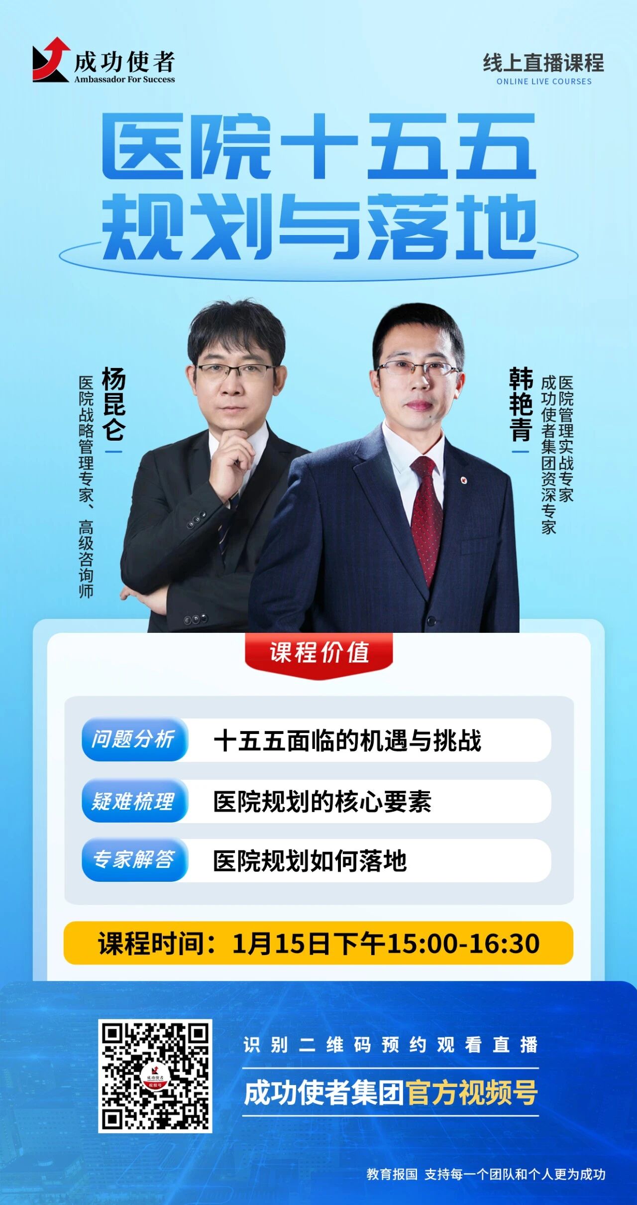 为此,成功使者集团将在1月15日15:00-16:30举办《医院“十五五”规划与落地》专题线上直播课程,旨在为医院顶层决策者提供前瞻性的思路、系统性的方法和可借鉴的实战经验。