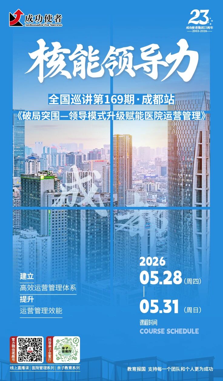 您好!成功使者集团举办的《核能领导力》全国巡讲第169期成都站《破局突围——领导模式升级赋能医院运营管理》课程将于5月28日-31日举办,特诚挚邀请您参加学习体验!