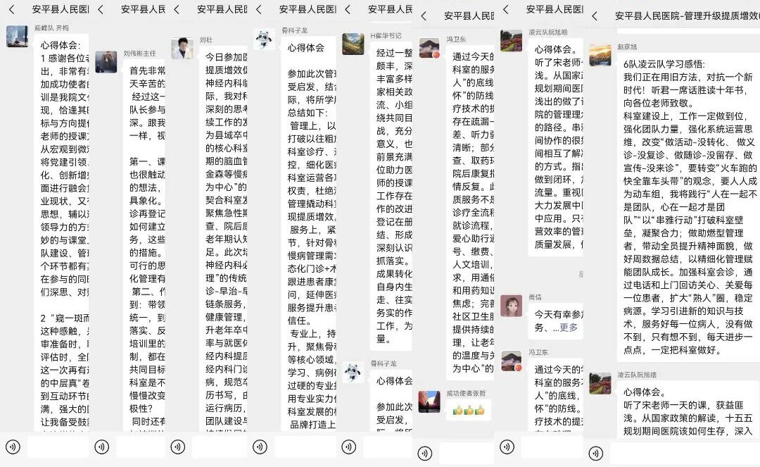 每天课程结束,参训人员都结合所学畅谈感悟,在交流中深化理解,在分享中共同提升,真正实现了把所学所悟转化为工作实效,立足科室打造、学科发展、人才培养、规范运营等各项工作,以更严谨的作风、更暖心的服务、更高效的执行力守护患者健康。