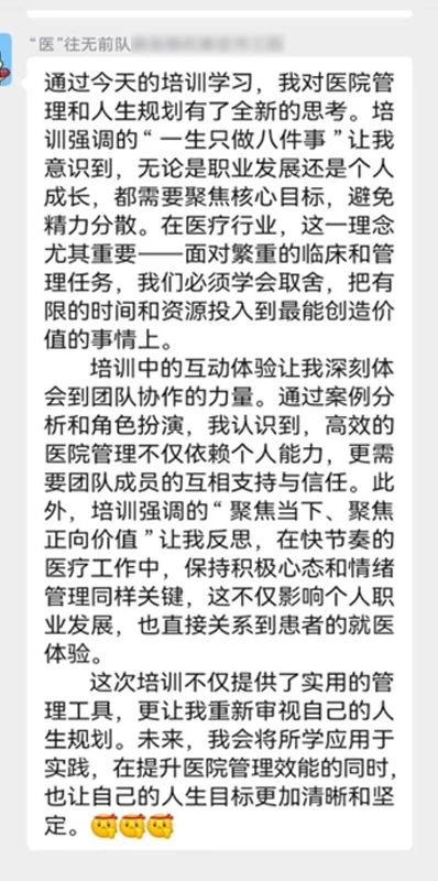 除上述分享外,课程还设置了多轮互动问答,老师们针对大家提出的困惑和难题给予了深入浅出的讲解。通过系统学习和深入交流,学员们普遍反映收获颇丰,有学员说:“这次课程既聚焦医院发展,又关乎个人成长,干货满满且贴合实际。”在大家的积极参与下,本次课程取得圆满成功。