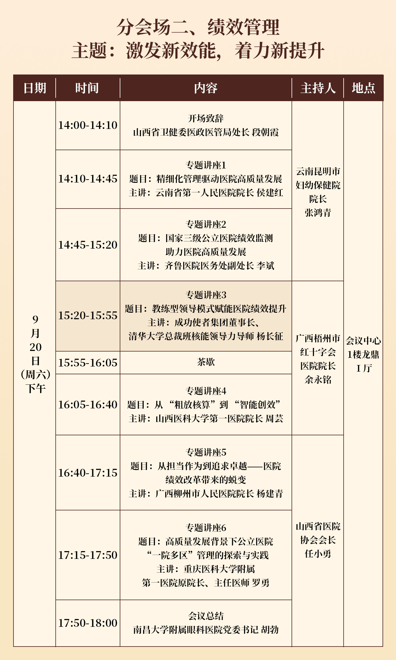 届时(9月20日15:20-15:55),成功使者集团董事长杨长征老师将在绩效管理分会场受邀分享“教练型领导模式赋能医院绩效提升”,为提升医院领导者的领导力、解决运营管理难题、激发员工工作热情等提供新思路。