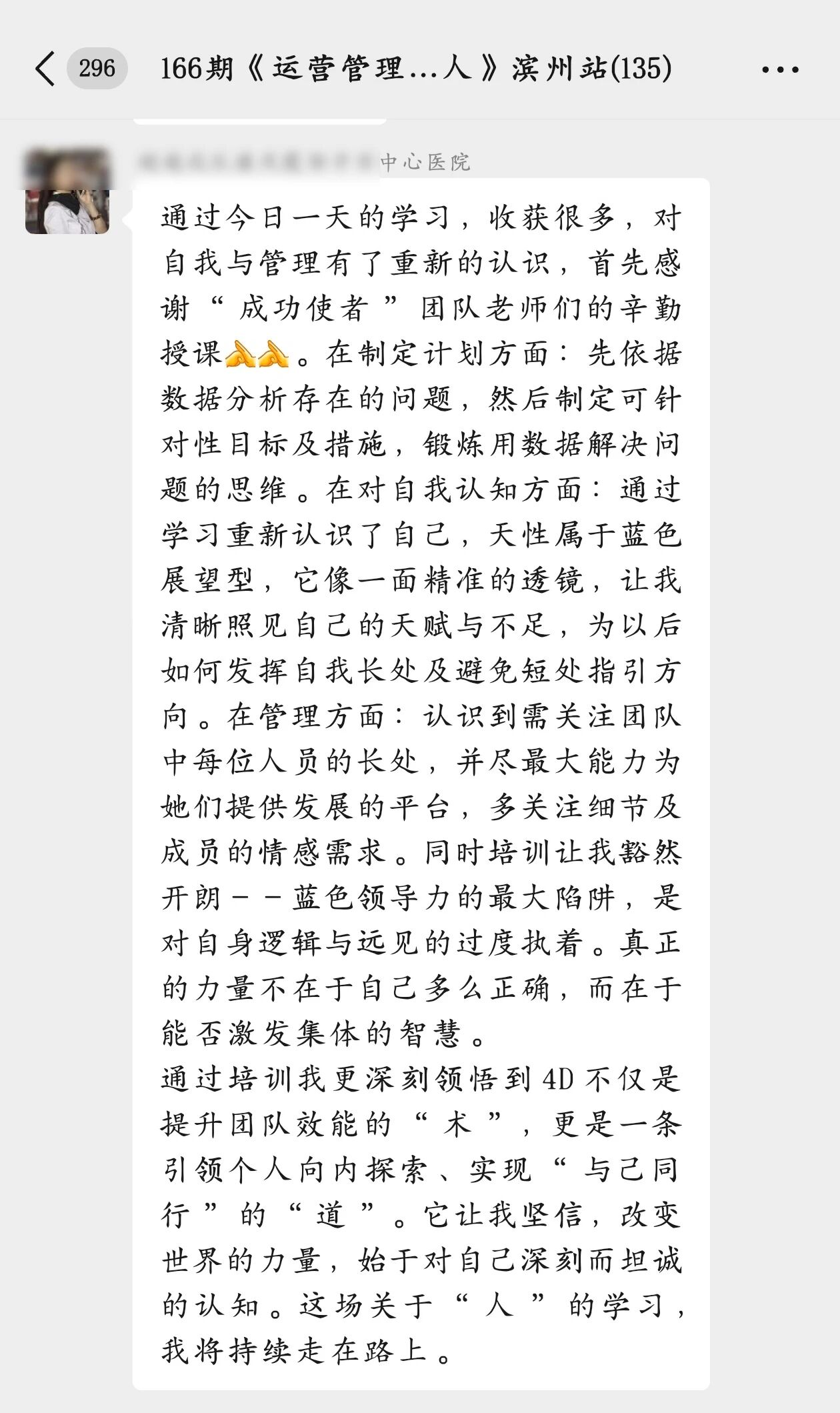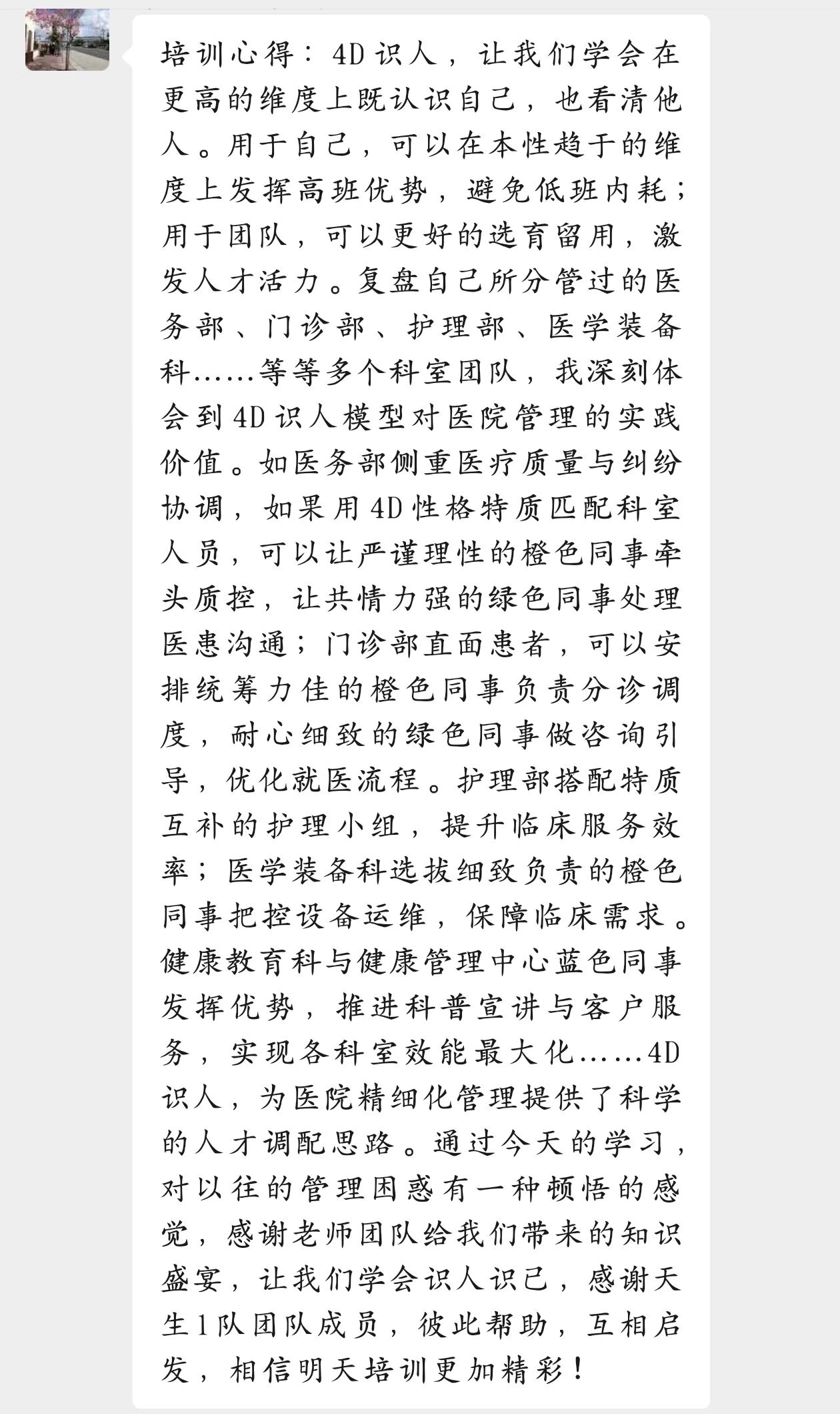 通过系统的学习研讨和深入的互动交流,学员们普遍反映收获颇丰。有学员说:“4D识人为医院精细化管理提供了科学的人才调配思路,让我对以往的管理困惑有种顿悟的感觉。”在大家的积极参与下,本次课程圆满收官。