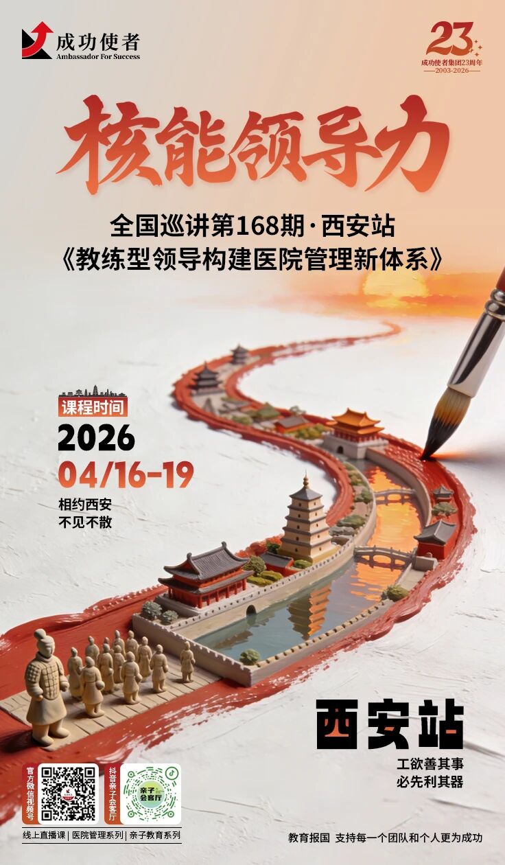 您好!成功使者集团举办的《核能领导力——教练型领导构建医院管理新体系》全国巡讲西安站将于2026年4月16日-19日举办,特诚挚邀请您参加学习体验!